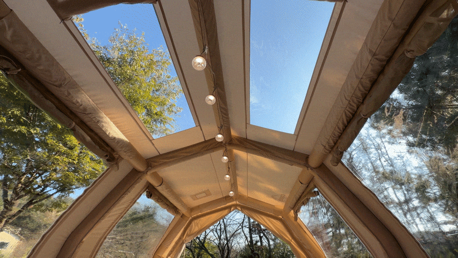 The inflatable frame maintains vertical tension, helping the tent retain its shape and interior volume even in changing conditions. Large TPU windows and integrated ventilation panels provide natural light, wide views, and controlled airflow without compromising protection.